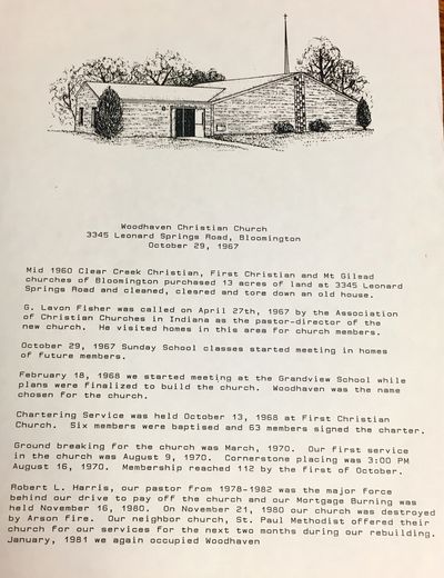 On October 14, 2018, Woodhaven Christian Church observed 50 years of service to the greater Bloomington community. The church's history was showcased each Sunday that month with a photo display as well as interesting articles and events from the past. We have provided Sunday school, Vacation Bible School, Easter Egg hunts, youth group activities, picnics and hayrides, women's fellowship activities, gospel sings, and fund raisers such as holiday bazaars over the years, with full-time and part-time ministers to aid in these endeavors. Our past has been productive, and we look forward to the future.