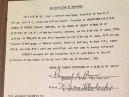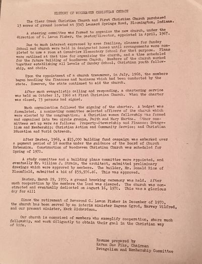 Woodhaven Christian Church was meeting at Grandview School on St. Rd. 45 W. before the church was built. Woodhaven was organized in the VanBuren township of Monroe County, IN. The Clear Creek and First Christian Churches purchased 13 acres on Leonard Springs Rd. where the church was built. The Mt. Gilead Christian Church also cooperated in the project and contributed money to it. A steering committee (picture to the right), made up of members from the three churches together with members of the new church, were responsible for planning and programming. The Association of Christian Churches in Indiana backed the project and provided initial leadership for it. The Woodhaven charter was signed on October 13, 1968, following which the church was formally organized.
